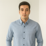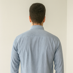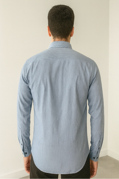 A timeless light blue shirt with subtle micro-textured stripes, button-down collar, and black button detailing. Perfect for both office wear and smart-casual styling.