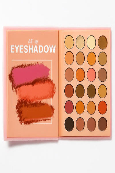 Eyeshadow Palette – A 24-shade set with warm neutrals, oranges, browns, and pinks in matte and shimmer finishes.