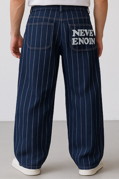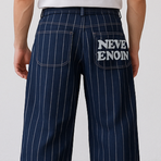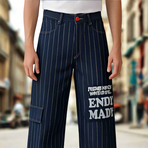Dark navy wide-leg cargo jeans with multiple utility pockets, designed in a relaxed fit. A minimal yet functional denim style for everyday wear.