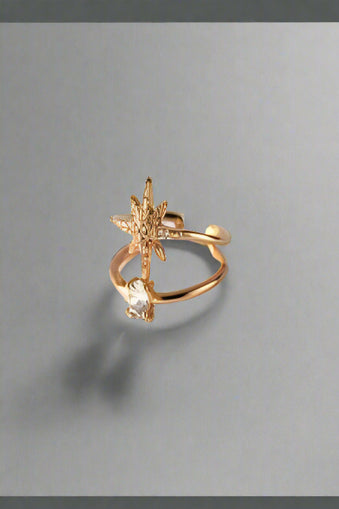A chic open gold ring featuring a dazzling starburst design paired with a small stone. Perfect for adding subtle sparkle to your jewelry collection.