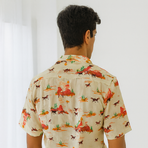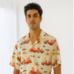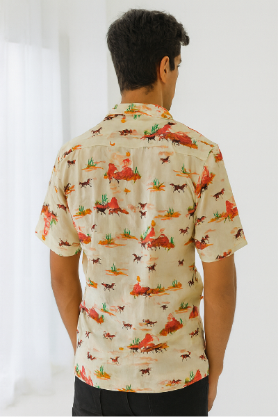 A unique short-sleeve shirt with desert-themed prints featuring horses, landscapes, and cactus designs. Perfect for adventurous styling.