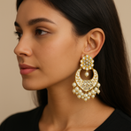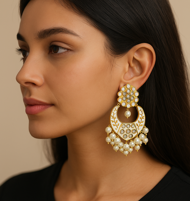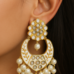 Embrace timeless elegance with these traditional chandbali earrings, beautifully crafted in golden finish with white enamel work. The design features intricate kundan stones set in floral and geometric patterns, accented with a dangling central pearl and a fringe of lustrous pearl clusters. Perfect for weddings, festive occasions, and cultural celebrations, these earrings blend classic charm with royal sophistication.