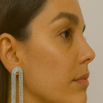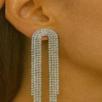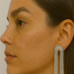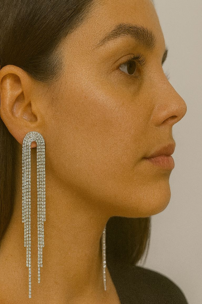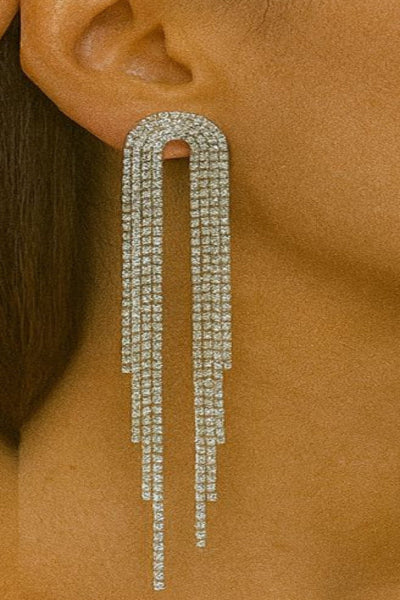 Dazzle in elegance with these silver crystal waterfall earrings, featuring a sleek arched top that cascades into multiple shimmering strands of crystals. Their elongated design and radiant sparkle create a bold yet graceful look, perfect for evening events, cocktail parties, and glamorous occasions. The modern geometric arch paired with cascading crystals ensures a luxurious, high-fashion finish that beautifully frames the face.