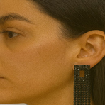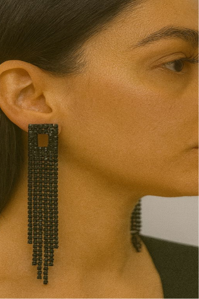 Make a striking statement with these black crystal fringe earrings, designed with a sleek rectangular stud top and cascading strands of shimmering black stones. Their dramatic length and modern geometric design add a bold touch of glamour, making them the perfect accessory for evening parties, red-carpet looks, and high-fashion styling. Lightweight yet impactful, these earrings exude confidence and sophistication.