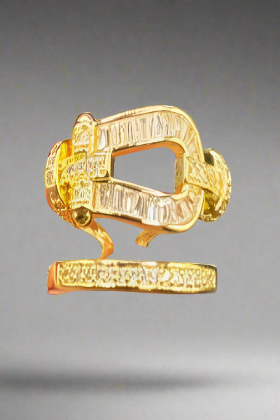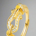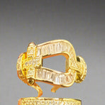 Description:An exquisite buckle-shaped gold ring embellished with sparkling cubic zirconia. A statement accessory that blends luxury and craftsmanship.