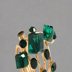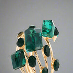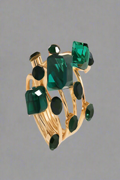 A glamorous gold-plated ring with large emerald green stones in a bold, artistic setting. Perfect for formal events or parties.