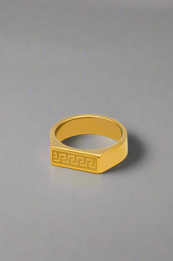A sleek, flat-edged gold band with geometric engraving for a modern and minimalist vibe. Ideal for stacking or wearing as a standalone piece.