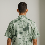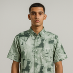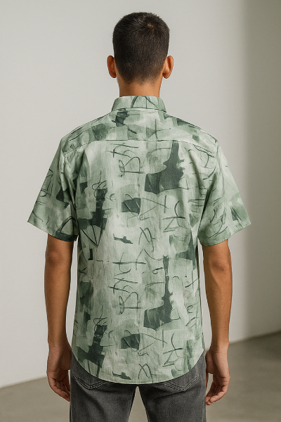 A casual short-sleeve shirt in a light green tone, decorated with abstract brushstroke patterns and subtle sketch-like motifs. Designed with a button-down front and a relaxed fit, this shirt is perfect for everyday wear with a modern artistic vibe.