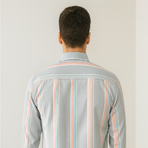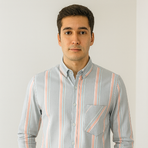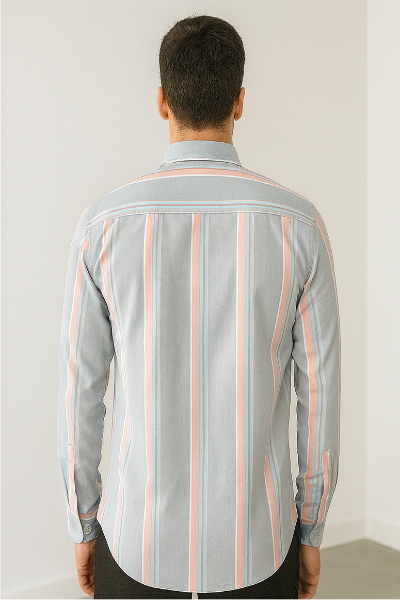 A soft grey base shirt with pastel pink and blue vertical stripes. Designed with a chest pocket and button-down collar for a balanced casual-smart appeal.