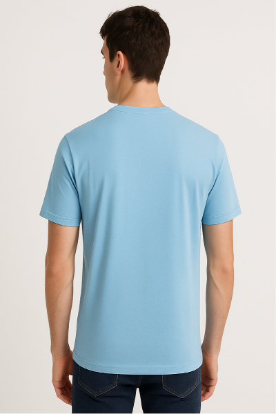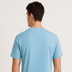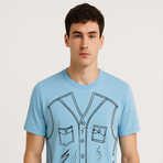 A light blue crew-neck t-shirt with a quirky black sketch print of a shirt design. Fun, casual, and unique for everyday wear.