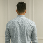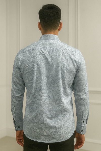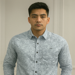 A light blue full-sleeve shirt with a unique abstract textured pattern. Featuring a chest pocket and a clean button-down style, this shirt blends casual charm with a polished edge.