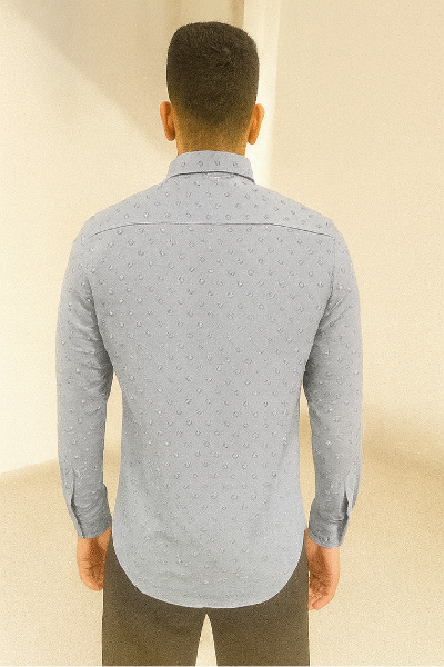 This light blue shirt comes with a subtle textured polka-dot pattern, giving it a modern twist. Perfect for semi-formal outings, it offers comfort with a refined touch.