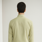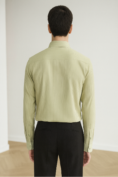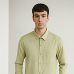 A fresh light green shirt with fine vertical stripes, adding depth and texture to a minimalist design. Finished with a classic collar and single chest pocket, it’s a smart option for daytime outings or office wear.