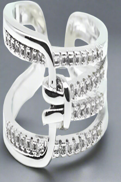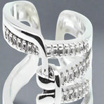 A sophisticated double-band ring with shimmering crystal pavé accents, designed with a modern open-link motif. Perfect for elevating evening or formal outfits.