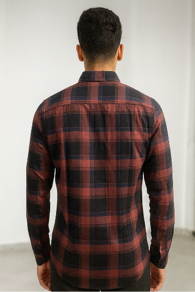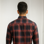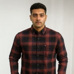 A stylish maroon and black checked shirt with a button-down front and chest pocket. The timeless checks make it suitable for both casual and smart casual dressing.