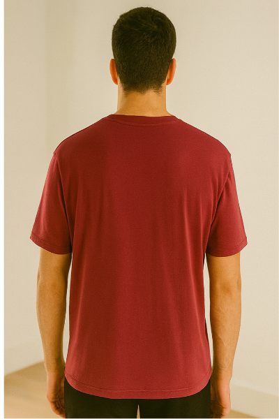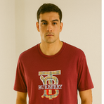 A stylish maroon round-neck t-shirt featuring a bold Burberry logo with a plaid design on the chest. Crafted from soft, breathable fabric, this t-shirt blends comfort with premium streetwear style.