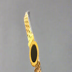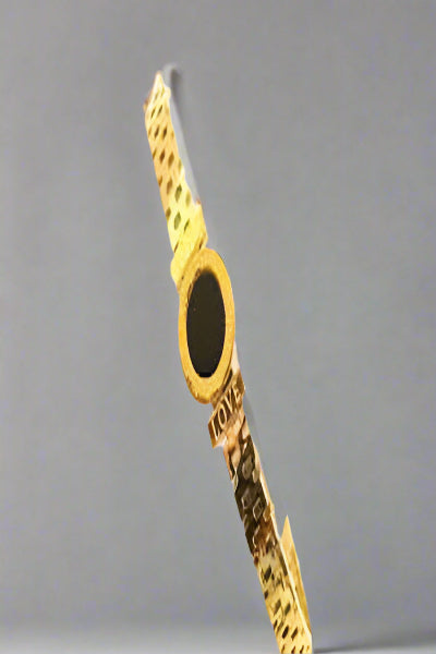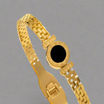 A sophisticated thin gold bracelet with a circular black enamel centerpiece. A lightweight accessory perfect for layering or a sleek solo look.