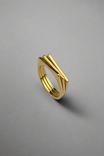 A unique multi-layered gold band with a bold architectural design. This contemporary piece adds a statement edge to both casual and formal looks.