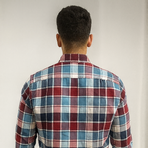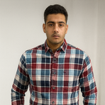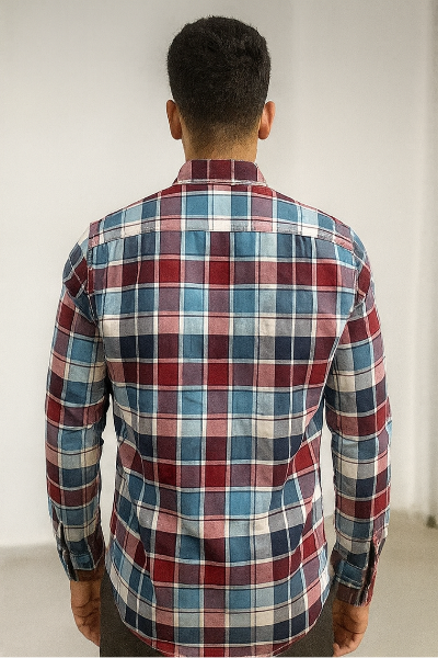 A vibrant red, blue, and white checked shirt with a classic collar and buttoned front. Its bright color combination adds a playful yet stylish touch to casual outfits.