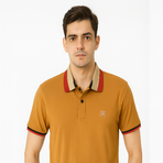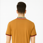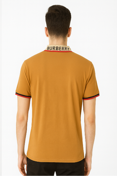 This mustard polo t-shirt stands out with its bold red and beige collar detailing. Featuring a small chest emblem and "Burberry" branding at the back of the collar, it combines elegance with casual sophistication.