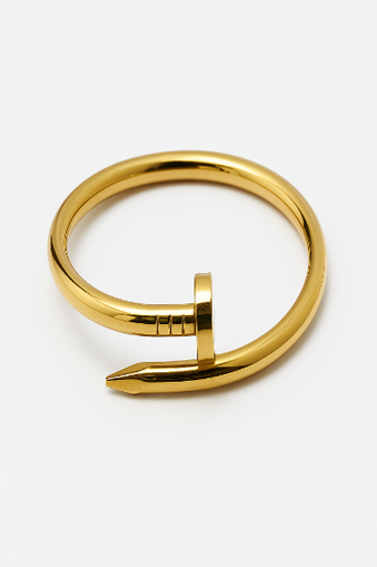 A sleek, polished gold bracelet designed in the shape of a bent nail. A stylish and edgy accessory symbolizing strength and uniqueness.