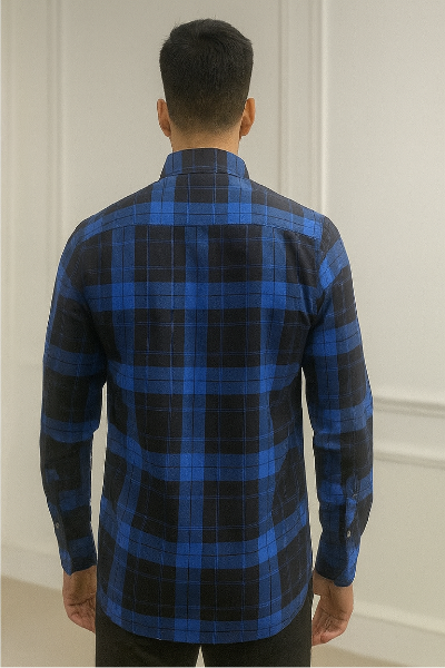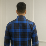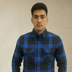 A bold navy blue and black checked shirt with dual front flap pockets. The strong check pattern gives it a casual outdoorsy feel, making it a wardrobe essential for layering or wearing solo.