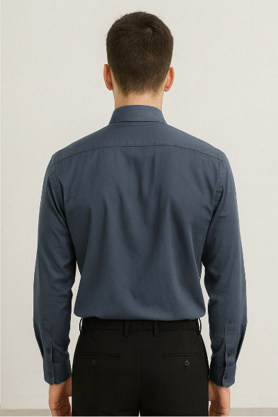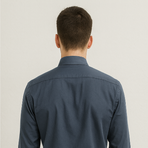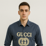 A deep navy blue full-sleeve shirt with a gold GUCCI logo, providing a rich and stylish appearance.