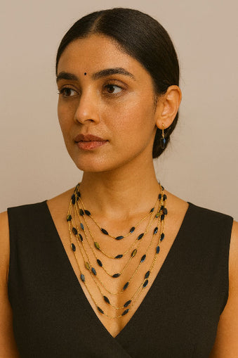 Grace your neckline with this sophisticated multi-layered necklace, crafted in delicate gold chains adorned with glossy black marquise-shaped beads. The layered design creates a cascading effect, offering a perfect balance of minimalism and elegance. Paired with matching drop earrings, this set is versatile enough for both traditional occasions and modern outfits. Its lightweight yet striking design makes it a timeless piece that enhances understated glamour.