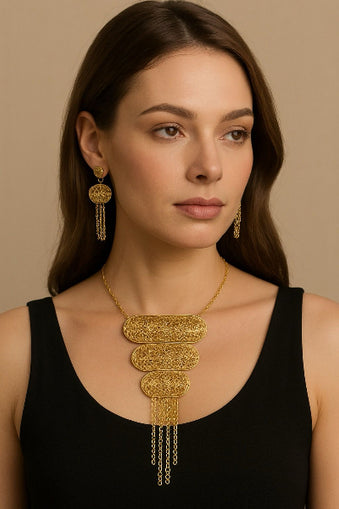 Make a striking impression with this contemporary gold-plated statement necklace set, featuring three intricately designed filigree oval motifs arranged in a cascading pattern. The necklace is enhanced with elegant dangling gold chain tassels, adding a touch of movement and drama to the design. Paired with matching filigree drop earrings with chain tassels, this set is a perfect blend of modern artistry and traditional elegance. Ideal for evening parties, festive occasions, or high-fashion events, it complements both western gowns and ethnic ensembles with ease.