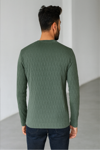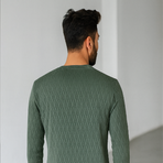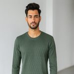 An olive green long-sleeve sweatshirt featuring an all-over diamond textured knit pattern. A unique piece that blends simplicity with refined design.