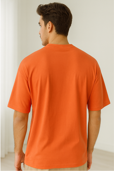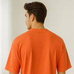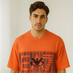 A vibrant orange oversized crew-neck t-shirt featuring the bold EA7 Emporio Armani logo across the chest. A statement piece with athletic appeal.