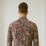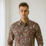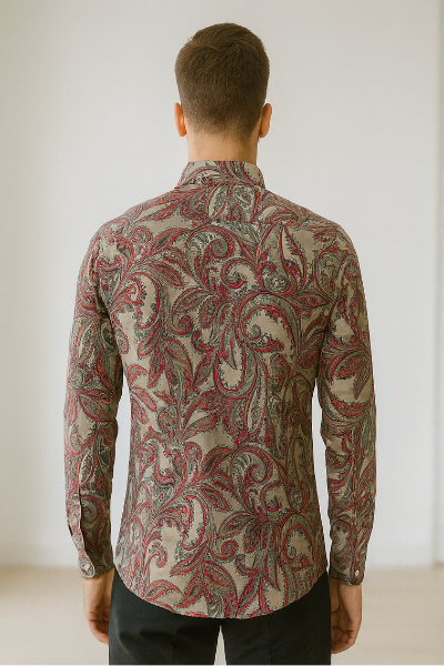 A stylish paisley-print shirt with swirling red and grey patterns on a muted background. Its intricate design makes it a standout piece for festive occasions or fashionable evenings out.