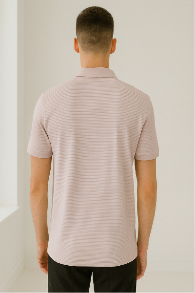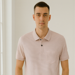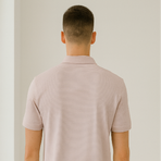 A soft pastel pink polo featuring fine horizontal stripes and a chest pocket, combining comfort with understated elegance.