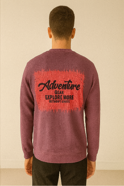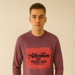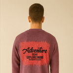 A purple crew-neck sweatshirt with bold "Adventure Gear – Explore More Without Limits" graphics on both front and back. A trendy pick for casual, outdoor-inspired streetwear.