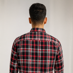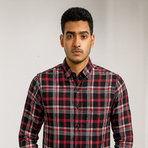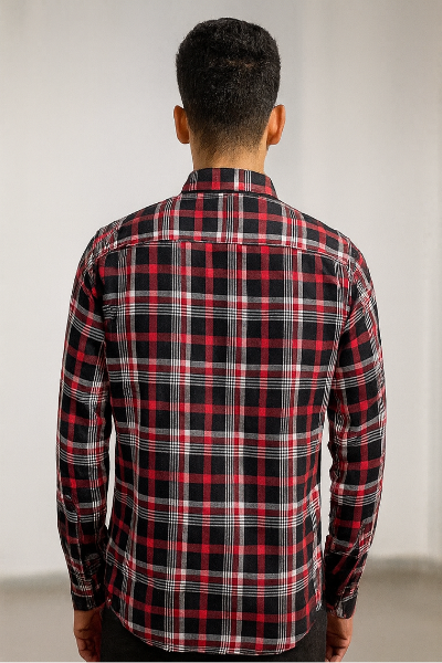 A red and black tartan full-sleeve shirt with classic checks, button closure, and a casual straight fit. Timeless wardrobe essential.