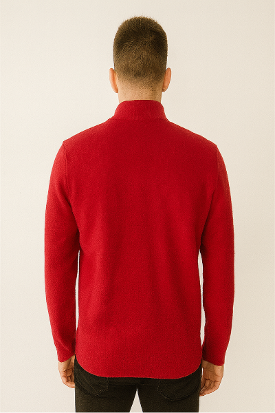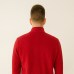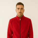 A bold red full-zip sweatshirt with a ribbed high neck and cozy wool-blend texture. Stylish, warm, and perfect for cooler days.