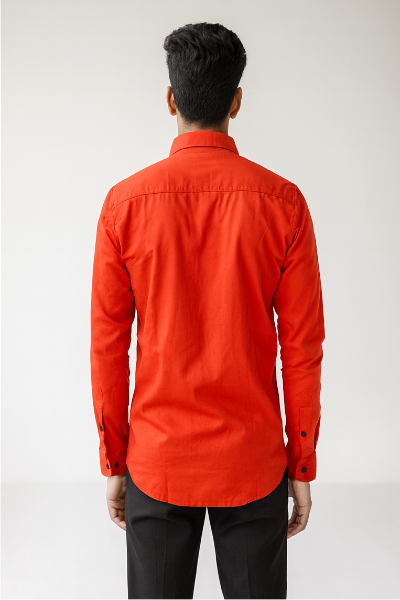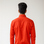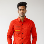 A vibrant red shirt with bold typography details and stripe accents on the front. Featuring a chest pocket and modern design elements, this shirt is perfect for those who want to make a strong style statement.