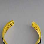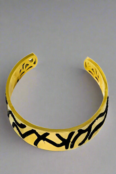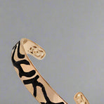 A trendy open cuff bracelet in rose gold with bold black enamel abstract detailing. A fashion-forward piece for those who love artistic accessories.