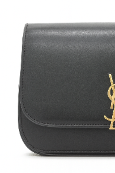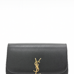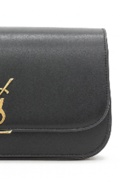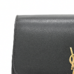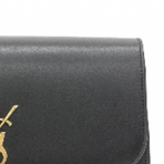 An iconic Saint Laurent clutch in smooth black leather, accented with the signature interlocking gold YSL monogram. Sleek, structured, and sophisticated, this piece is perfect for evening outings and formal events.