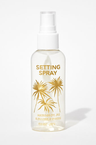 A transparent spray bottle with golden palm tree graphics, designed to set makeup in place for long-lasting wear.