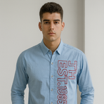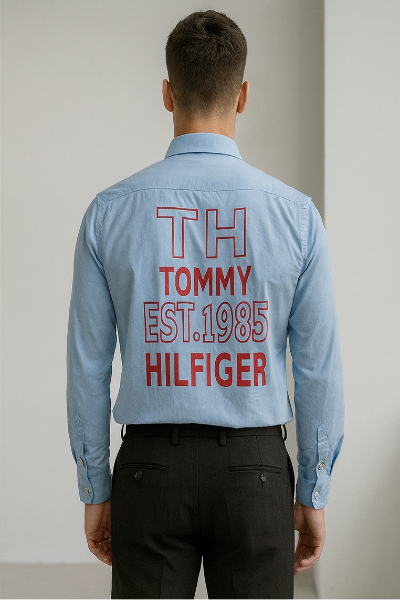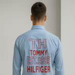A sky-blue shirt featuring bold embroidered branding on the front and back, with “TH EST.1985 HILFIGER” text in contrasting red and navy. This shirt blends casual wear with iconic street-style flair.