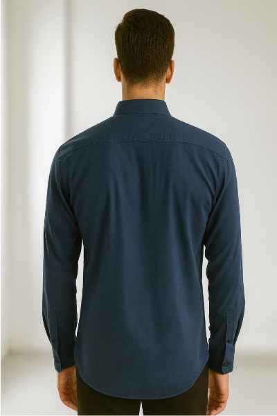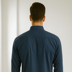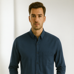 A versatile navy blue shirt with a plain solid finish, chest pocket, and buttoned cuffs. A wardrobe essential that pairs effortlessly with both formal trousers and casual chinos.