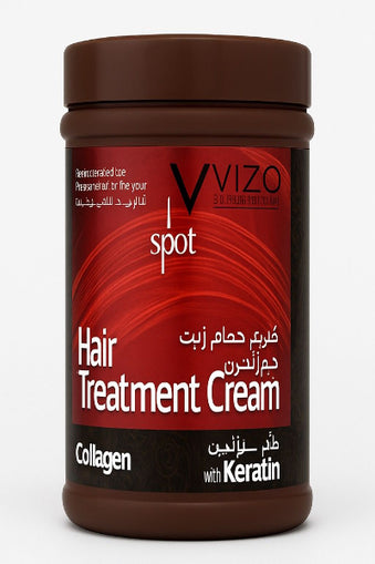 A deep brown jar with red label, containing Hair Treatment Cream with Collagen & Keratin. A nourishing cream for strengthening and repairing hair.